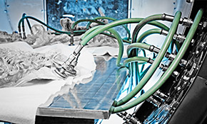 Der Horizontalflechter verfügt über 144 Klöppel, einstellbare Fadenspannung und ermöglicht eine Stehfadenablage ohne unerwünschte Ondulation. Die Durchführung der Kerne geschieht robotergestützt.